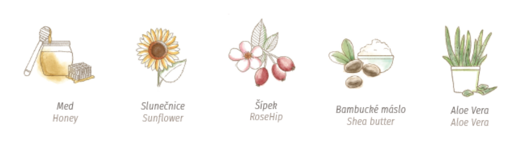 Voda, slunečnicový olej ze semen, oxid zinečnatý, kaprylový/kaprinový triglycerid, polyglyceryl-3 polyricinoleát, extrakt z listů Aloe Barbadensis, glycerin, cetearyl alba, bambucké máslo, šípkový olej, sójový olej, vitamin E, chlorid sodný, kyselina dehydrooctová, sorbát draselný, Glyceryl Caprate, Benzyl Alkohol